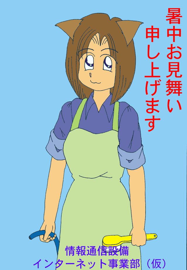 「情報通信設備インターネット事業部(仮)」を運営なさっている墨東301さんから頂きました。ネコ耳の女の子の絵ですね。ホースとブラシを持っているとこを見ると、洗車でも始めるのでしょうか。夏場は洗車等水をまく行為をすると、涼しくて良いですよね。 どうもありがとうございます。 えぷろん(ぼそ)