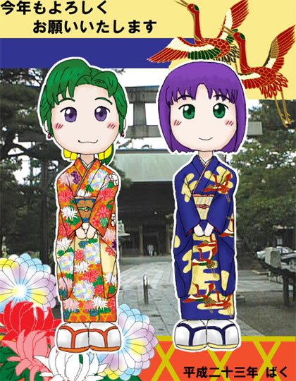 「ひろしの部屋」を運営なさっているばくさんから、年賀状を戴きました。 芦奈野ひとし先生の「ヨコハマ買い出し紀行」から、振り袖ピンキー風のアルファさんとココネさん。艶やかな着物姿が良いですね。 どうもありがとうございました。