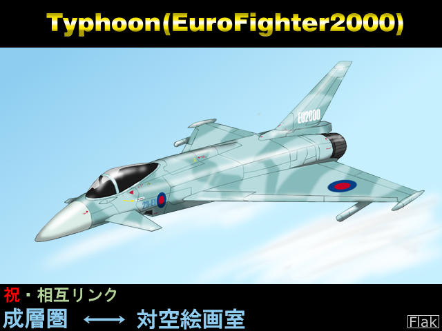 HAY!さんのHP「成層圏」とのリンク記念に送りつけたCGです。「ユーロファイター2000」として、欧州4ヶ国(イギリス、ドイツ、イタリア、スペイン)が共同開発していた、次世代戦闘機です。昨年名称が「タイフーン」に決定したと覚えています。 ノーズ・コーンが下がっているだとか、ブラケット・シュート・コーンが適当だとか、エアインテークがなっていないとか(その他諸々)は画力のなさの証明ですね。 それ以上になぜ「タイフーン」なのか、イギリス人に聞いてみたいです。