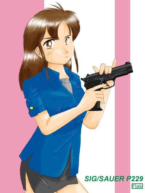 「女の子だけ描くのもなんだから、何か持っている絵にしよう」というわけで、拳銃を構える女性。でも、実際に存在するものを描くのは難しいと実感しました。質感・ディテール等々数えればいくらでも至らぬ点が出てきます。「雰囲気だけでも」と思っても、背景なしじゃストーリーがうかばないし。もっと勉強しなくては。と言い訳をかきかきしておいて、銃に刻印がないとか、スライドレールが短いとか、滑り止めの溝が足りないとか大目に見て下さい。