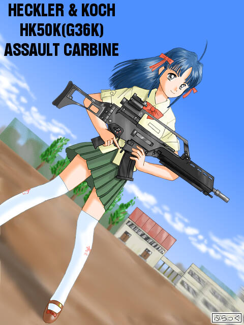 HK50は、ドイツ・ヘッケラー&コッホ社が開発・製造しているアサルトライフルで、1996年にドイツ軍の制式ライフルとなりG36の制式名がつきました。HK50K(G36K)は、HK50のバレルを切りつめたカービンライフルで、全長855mm、重量3600g、口径5.56mm×45、装弾数30発となっています。