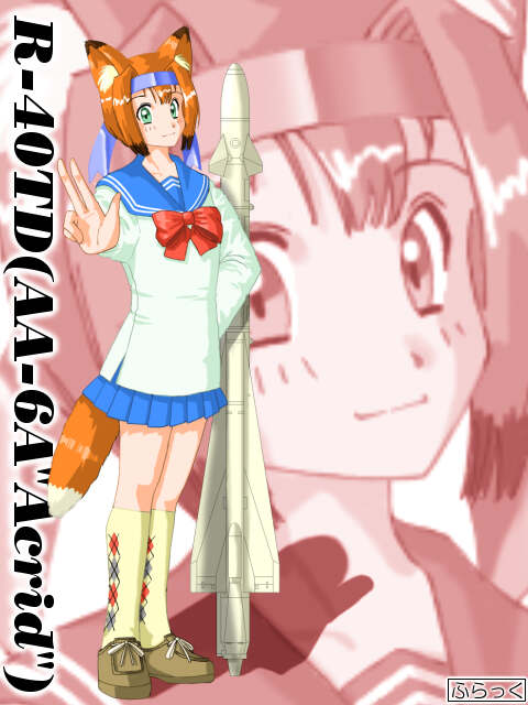 恒例の"ミサイルコスプレ女子校生"扉絵。3周年+3万ヒット記念と言うことで、新キャラの登場です。HPのマスコット的存在になり仰せた「アメショー」に対抗し、ロシアが送りつけた切り札はMiG-25「Foxbat」。恐らくFoxbatとは大コウモリの意味だと思うのですが、キツネ娘(アカギツネ)の方が萌えるそうなので、このようになりました(笑)。財政難で旧型機となっていることは、この際ご愛敬と言うことで。しかし、マッハ3を誇るその俊足は健在です。