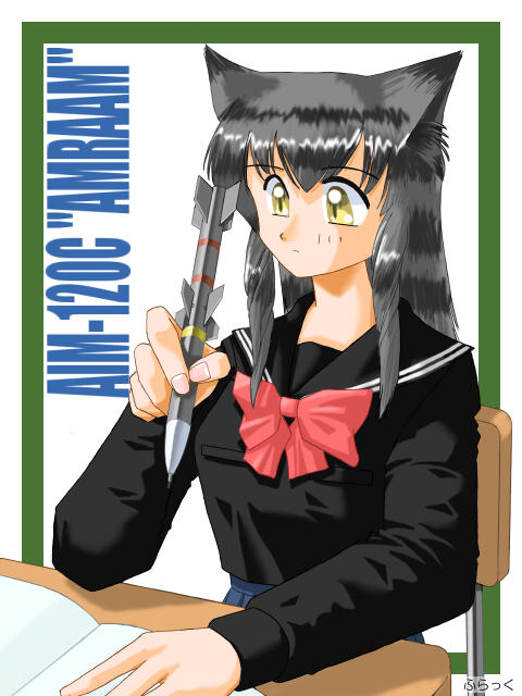 さて、手にしているシャープペンシルは、アメリカの誇る最新鋭空対空ミサイルAIM-120C「AMRAAM」を模しています。AIM-120は、中距離空対空ミサイルAIM-7「スパロー」の後継ミサイルで、セミアクティブホーミング方式(命中するまで、母機が目標にレーダー波を照射しなければならない)だったスパローに対し、アクティブレーダーホーミング方式(ミサイル自体にレーダー波の発信装置がついており、撃ちっぱなしができる)を採用し、また高速・小型。軽量になっています。