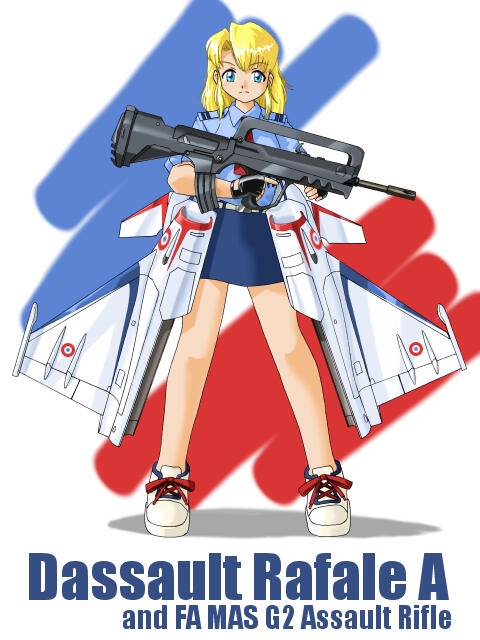 空軍調のシャツにアサルトライフルが不似合いというか、意味不明な問題作。それ以上に、ライフルと女の子のスケールがまずった。ライフルの全長760mmなので、女の子の身長は140cmくらいしかないことに(汗)。つまり、ろりろりってカンジ(爆)