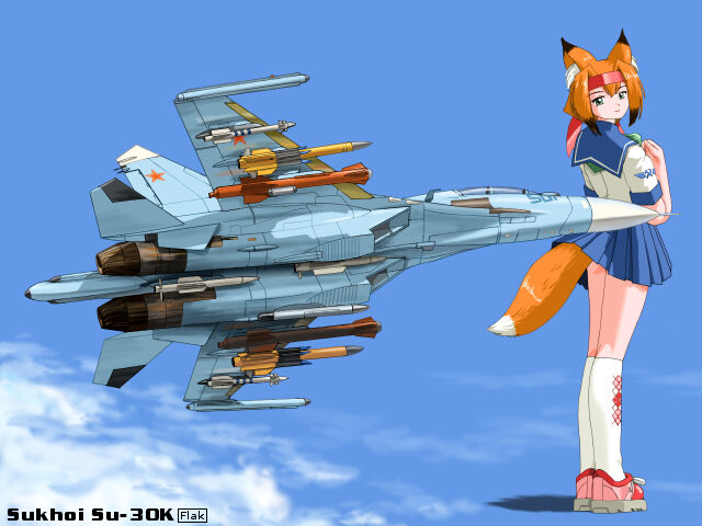 イラストはマルチロールフランカーのSu-30Kと、ロシア担当のセレ。今回はSu-30Kが主役なので、セレは控えめに(笑)。そのせいか、640×480にトリミングした後のセレの表情は、なんともさみしそうに見えてしまいます。1280×960の作業サイズでは、それほどでもなかったのですが・・・(笑)