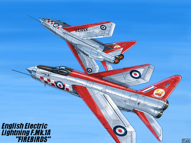 イギリス機が好きだと言いつつ、これまでライトニングはまともに描いていなかったので、ここ一発奮起して描きました。1963年にイギリス空軍公式デモンストレーションチームとなった、第56戦闘機飛行隊「FIREBIRDS」からライトニングMk.F.1Aです。