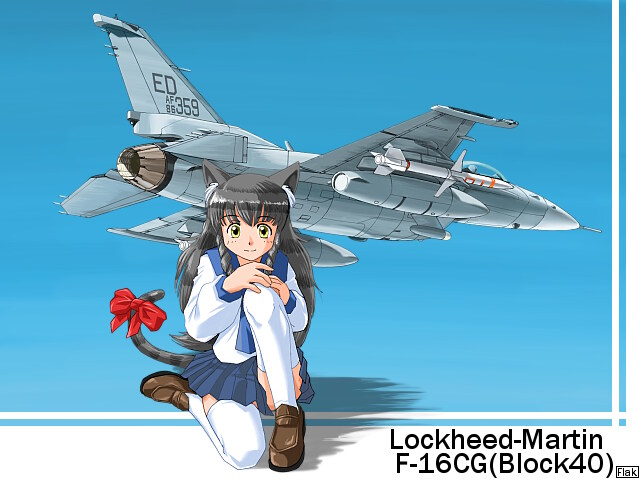 皆さんご存知、ロッキード・マーチンF-16「ファイティングファルコン」戦闘機の登場です。付け合せは当ページのアメリカ担当看板娘であるフェニ。実はフェニ、2004年のクリスマス以来、1年2ヶ月ぶりの登場となります。看板娘登場のスパンが、おおむね1年を超えているため、毎年だれかこぼれる計算。今年はいなはさんが危険か?(笑)
