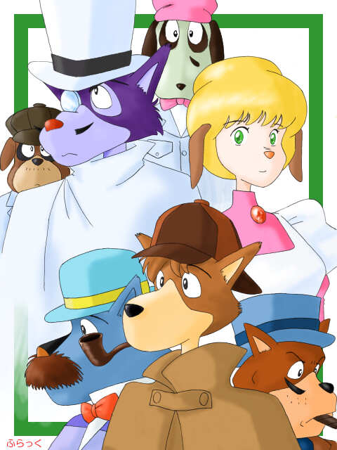ばくさんのかばんさんのHPである「ひろしの部屋」の「テーマギャラリー」参加作品です。今回のテーマは「犬」でしたので、犬と言えばこれしかない!!という感じで描きました。資料はずいぶんと前に録画してあった映画版のホームズ。おかげでつい見入ってしまいました(笑)。「ドーバー海峡の空中戦」はテンポがいいですよ。これこそ宮崎駿という感じ(笑)。 そんなわけで、一応メインキャラ全員を描いてみました。あなたは全員の名前が分かりますか? それ以上に、似てねぇ(爆)。