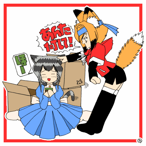 「荷造り」 さらばODN。これからはPUネットで頑張ります。 そんな状況を絵にしたモノです。たぶん。 このイラストは、引っ越しお知らせイラストとして、未来永劫、ODNの旧トップページに貼られるのでした(完)。 [ Back ]