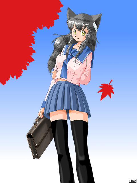 「秋色フェニ」 「7万記念は、是非フェニで」 5周年記念にエミリを描いてから、そんなご要望というか脅迫が続いておりました。そんなわけで、フェニです。季節柄、落ち葉なんぞ記号的にあしらってみましたが、手抜きは隠し切れません。 まあ7万記念に合わせた突貫工事絵ということで、ご勘弁を。 というか、しっぽ描き忘れている時点で、まじめに絵を描く気があるのか非常に疑問です(笑)。
