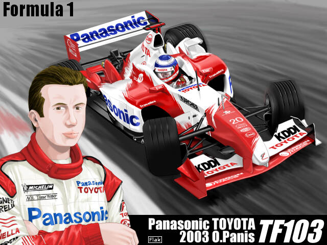 と、イラストは、2003年F1マシン、トヨタTF103と、そのドライバー、オリビエ・パニス選手です。
