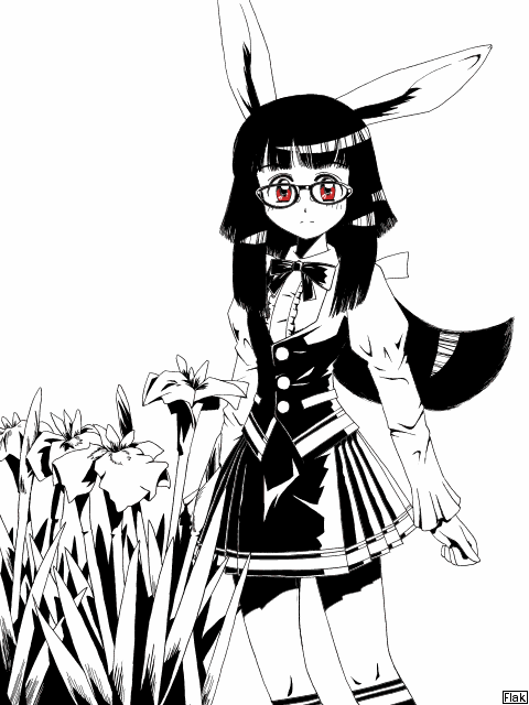 「モノトーンいなはさん」 ちょっと趣向を変えて、白黒絵。 今の自分の技量でペン画風に描いたらどうなるかってテストです。まあ、今年初めて描いた絵なので、リハビリがてらって訳ですよ(汗) そんなわけで、一番コントラストの強い配色の、いなはさんに登場してもらいました。加えて彼女、最近は巫女姿でしか描いていないので、たまには制服姿で描いてあげようと思いまして(笑) なお手前に配した花は、アヤメのつもり。初夏の花なんで、ちょっと気が早いかしら?(爆)