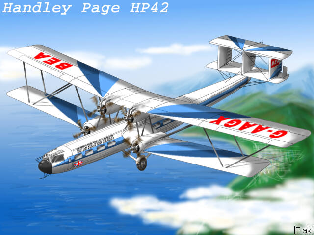 HP42はイギリス・ハンドレーページ社が開発した4発の大型旅客機です。中心線近くに配されたエンジンは、故障に対するバランス変動を最小限に抑える工夫です。またエンジン付近はトイレと荷物室になっており、騒音対策としています。なお本機はトイレを完備した初めての旅客機でした。
