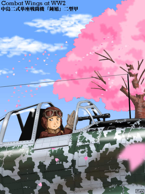 絵の二型甲は、エンジンをハ109(1450馬力)に換装した機体で、最大速度605km/hを誇りました。武装は7.7mm機銃と12.7mmm機銃をそれぞれ2丁、計4丁装備していました。同時期の海軍戦闘機である零式艦上戦闘機と比較して貧弱の感がありますが、その上昇力と加速力で、主に対爆撃機戦で活躍しました。戦争後期になると、40mmロケット砲を装備した二型乙、12.7mm機銃4丁の二型丙等の改良機も投入されました。