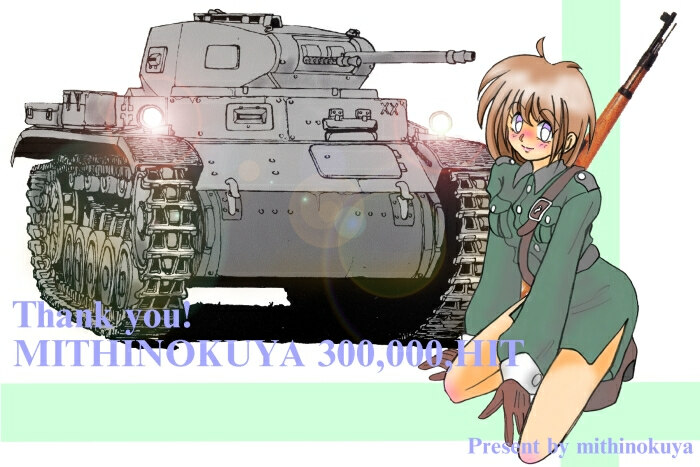 「陸奥屋」を運営なさっている陸奥屋さんより、氏のウエブサイト30万ヒットの記念として頂きました。絵はドイツの2号戦車です。砲塔に7.92mm機銃が付いていて、かつ後部の工具箱がないこと、転輪が5個で補助輪が付いていること、以上からF型だと思うのですが、自信はないです(笑)。