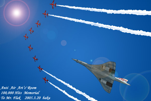 「RED ARROWS & CONCORDE」 10万ヒット記念として、「ひろしの部屋」を運営なさっておりますばくさんのばんさんより頂きました。 イギリス空軍の曲技飛行隊「レッドアローズ」とコンコルドの、見事な編隊飛行のイラストです。蒼空をバックに、白いスモークが非常に映えますね。レンズフレアも良い感じです。 素敵なイラスト、どうもありがとうございました。
