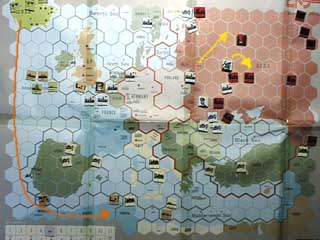 地上戦では、独ソ戦が激しさを増します。ハリコフとモスクワをめぐる戦いで、両軍とも大損害(ドイツは空軍1、装甲2、歩兵3、将軍2、ソ連で戦車3、歩兵1、将軍1)を受けます。が冬という不利な条件の中善戦したドイツ軍は、ついにハリコフを占領、ソ連の生産力を大幅に低下させることに成功しました。もはやソ連には、5ポイント(※9)しか生産拠点が残っていません。