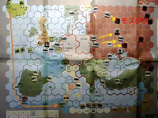 ソ連はアメリカのレンドリース(※10)で得た戦車部隊をもって反撃を試みますが各所で敗退、ついにモスクワが陥落します。結局前ターンを上回る戦車3、歩兵2、将軍1の損害を受けます。連合国側が西部戦線で積極攻勢に出て、ドイツ軍をソ連領内から引き抜かせない限り、ソ連はドイツに屈する可能性がでてきました。