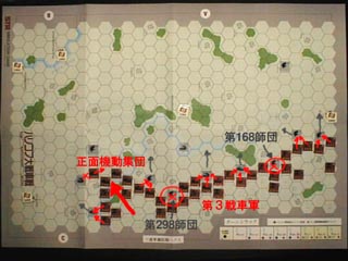 敵歩兵師団に自軍の戦車軍団を接敵させ、敵戦線の弱い部分からの分断をはかる。