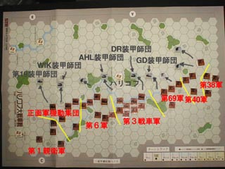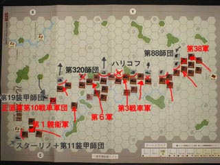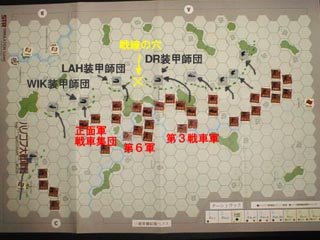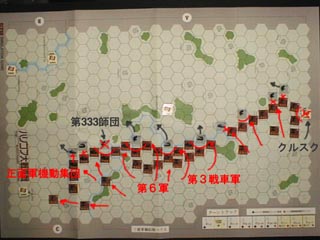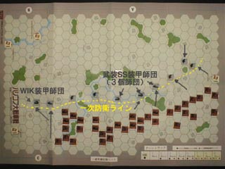 第1ターンの対応移動の結果、WIK装甲師団(ヴィーキングSS装甲師団)正面軍第4親衛戦車軍団の撃退に成功したものの「焼け石に水」状態。2個師団の壊滅は防ぎようがない。