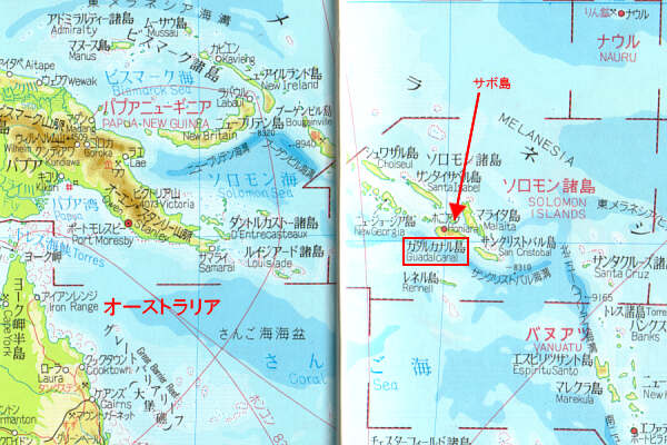 ソロモン諸島は、オーストラリア大陸の東、赤道よりやや南に位置する一連の群島の名称で、サンタイザベル島、ニュージョージア島、サンクリストバル島等からなります。そしてその中央に浮かぶ島が、太平洋戦争における激戦地の一つであるガダルカナル島です(右図参照 二宮書房「現代地図帳1991-92」より抜粋」)。