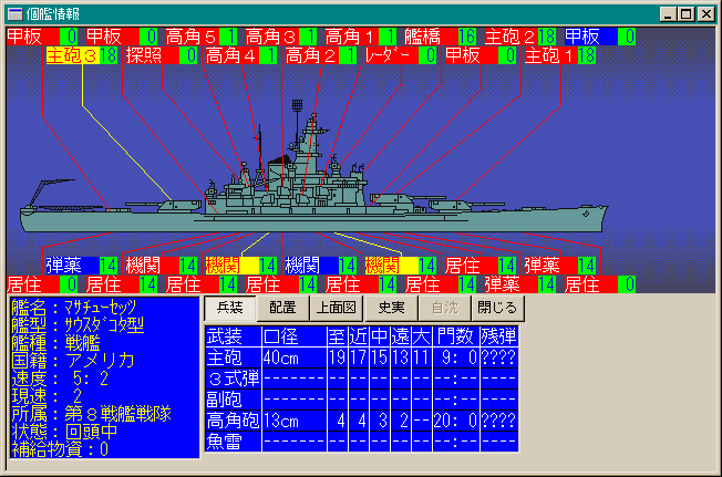 7ターン、米第8戦艦戦隊を視界に捕らえた武蔵が、初めてその46cm砲を放ちます。左砲戦より放たれた9発の46cm砲弾は、7900mの近距離にいたマサチューセッツを捕らえ、もっとも強固に装甲されていた司令塔を引き裂きます。また比叡、霧島、金剛、榛名もアラバマ、インディアナに砲火を集中させ、高角砲やレーダー等を破壊し、機関部にも若干の損害を与えることに成功します。